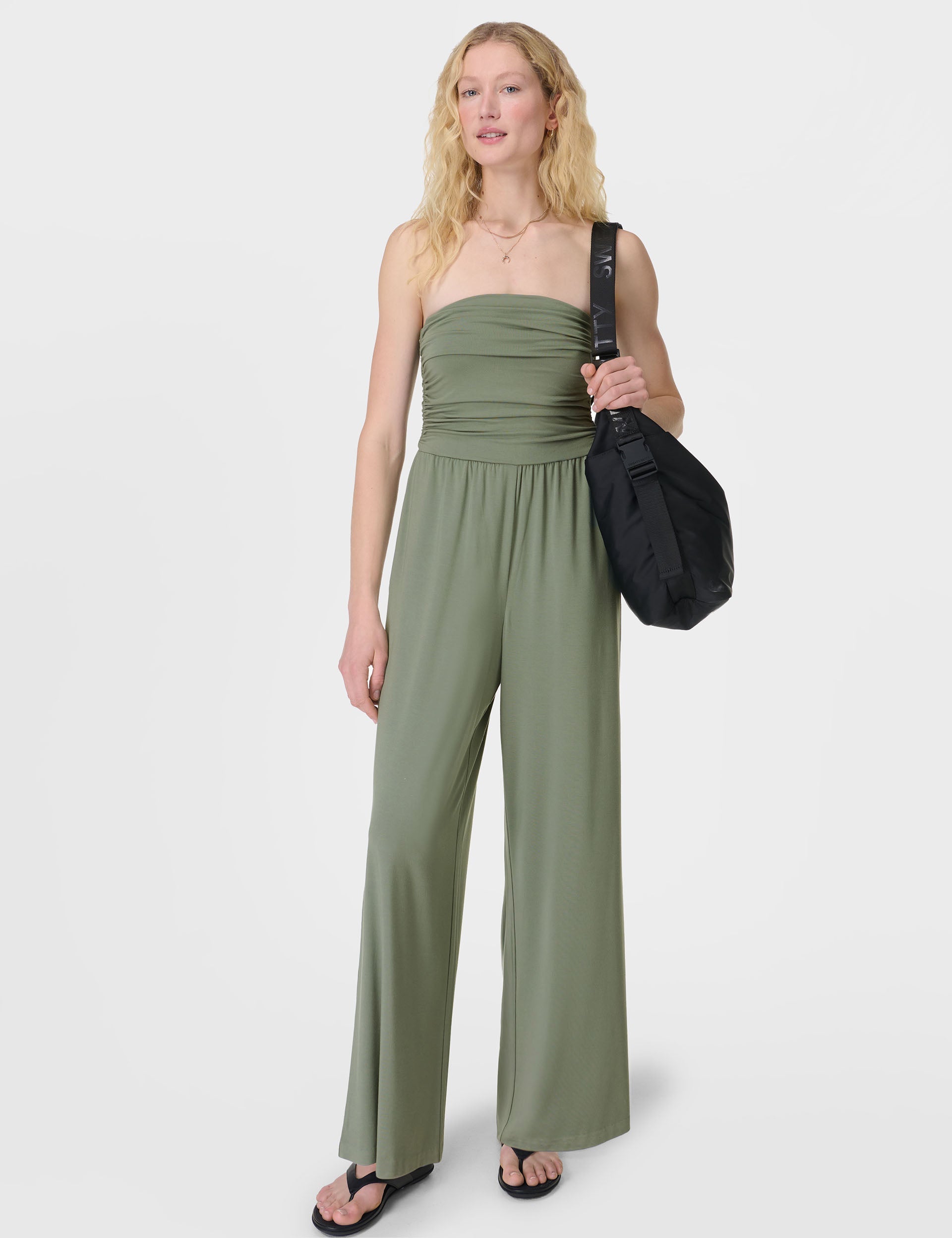 Unwind in the Modal Wide Leg Jumpsuit, designed in an ultra-soft, stretchy modal blend with a wide-leg silhouette and ruched bandeau neckline for a flattering fit. Its two side slip pockets add a place to carry essentials, perfect for casual brunches.